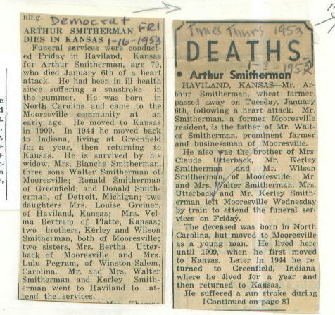 | Survived By | Wife, Blanche Smitherman; 3 sons, Walter, Ronald, and Donald Smitherman; 2 daughters; 2 brothers, Kerley and Wilson Smitherman; 2 sisters, Bertha Utterback and Lulu Pegram. |