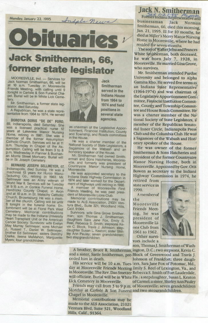 | Other | Age 66. Carlisle funeral at Mooresville Friends Church. Buried Jan. 24, 1995. White Lick cemetery. Parents: Walter and Frances White Smitherman. Rep. State representative; Smitherman Hatcheries. |