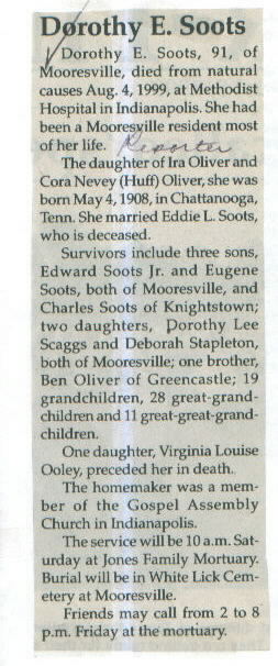 | Survived By | 3 sons, Edward, Jr., Eugene, and Charles Soots; 2 daughters, Dorothy Lee Scaggs and Deborah Stapleton; brother, Ben Oliver; 19 grandchildren; 28 great- grandchildren; 11 great-great-grandchildren. (A daughter, Virginia Louise Ooley, is deceased.) |