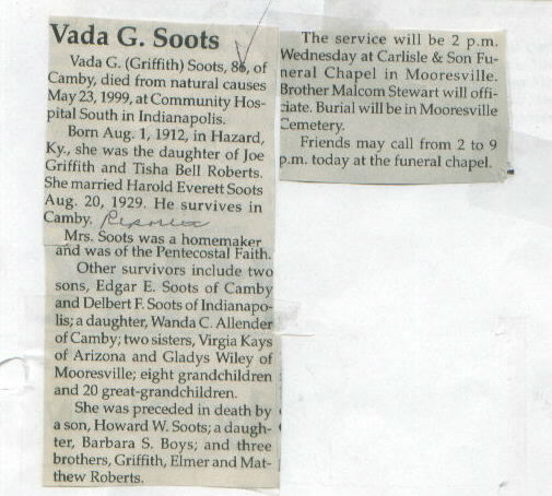 Other Age 86. Carlisle Chapel (Bro. Malcolm Stewart officiating.) Buried Mooresville Cemetery. Parents: Joe Griffith and Tisha Bell Roberts. Died at Community South Hospital; born in Hazard, Ky.