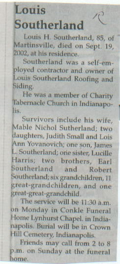 | Survived By | Widow; 2 daughters, Judith Small and Lois Ann Yovanovich; son, James L. Southerland; 2 brothers, Earl and Robert Southerland; 6 grandchildren; 11 great-grandchildren; one great-great-grandchild. |