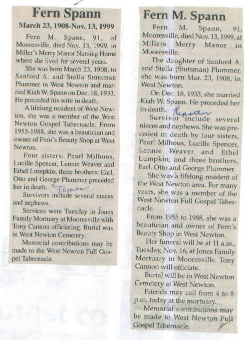 Other Age 91. Jones mortuary. Buried West Newton cemetery. Parents: Sanford A. and Stella Stutsman Plummer. Beautician at Ferns Beauty Shop, West Newton. Died at Miller's Merry Manor; born at West Newton.
