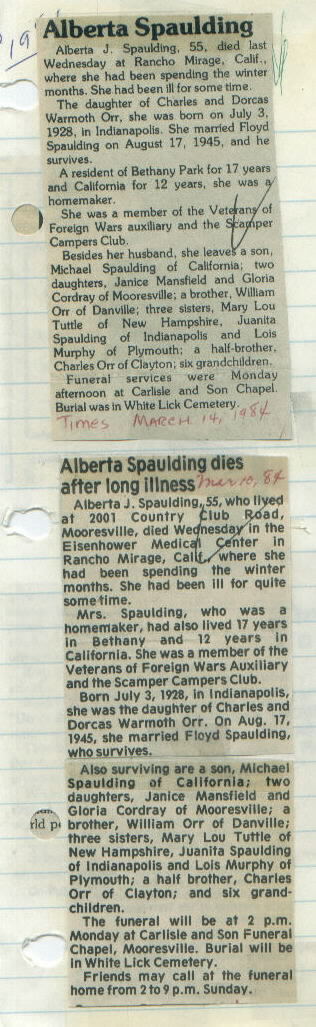 | Survived By | Husband; son, Michael Spaulding of Calif.; 2 daughters, Janice Mansfield and Gloria Cordray; brother, William Orr; 3 sisters, Mary Lou Tuttle, Juanita Spaulding, and Lois Murphy; half brother, Charles Orr; 6 grandchildren. |