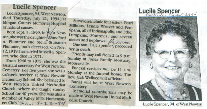 | Other | Age 94. Jones Mortuary (Rev. Jack Wallace officiating.) Buried West Newton cemetery. Worked at West Newton elementary school. Taught Sunday School 40 years. Parents: Sanford A. and Stella Stutsman Plummer. Died in Morgan County hospital. |