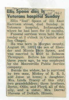 | Other | Age 68. Employed for a long time at Mooresville Public Service Co., also with the Interurban line. Parents: Elander and Minnie Bain Spoon. Carlisle Funeral. WW I veteran. |