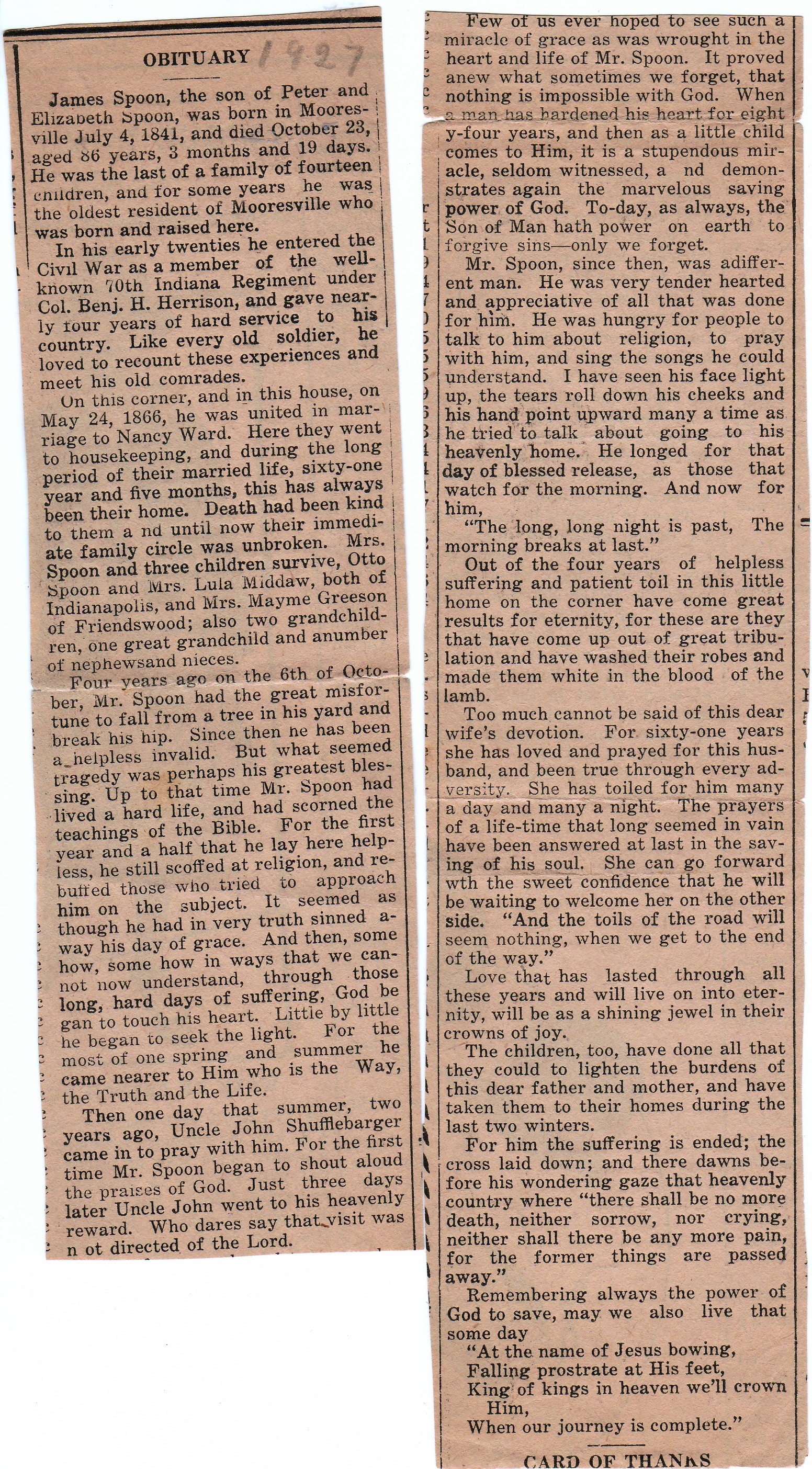 | Other | Age 86 years, 3 months, and 19 days. Born in Mooresville, Indiana; son of Peter and Elizabeth Spoon. "On the 6th of October, 1923, Mr. Spoon had the misfortune to fall from a tree in his yard and break his hip. Since then he has been a helpless invalid. Last of a family of 14 children; for many years, he was the oldest resident of Mooresville to have been born and raised here." Civil War veteran, Co. D, 70th Ind. Reg. under Col. Benjamin H. Harrison, for 4 years. Loved to recount his experiences and to meet old comrades. |