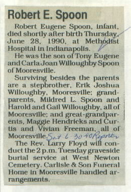 | Survived By | Parents, Tony Eugene and Carla Joan Willoughby Spoon; stepbrother, Erik Joshua Willoughby; grandmother, Mildred L. Spoon; grandparents, Harold and Gail Willoughby; great-grandparents, Maggie Hendricks and Curtis & Vivian Freeman. |
