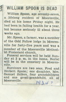 | Survived By | Sons, Fred and Herbert Spoon; daughter, Mrs. Samuel Sellars; 4 grandchildren; 1 great-grandchild; 2 sisters, Mrs. Allie Beasley and Mrs. Margaret Colee; 2 brothers, Lawrence and Alva Spoon. |