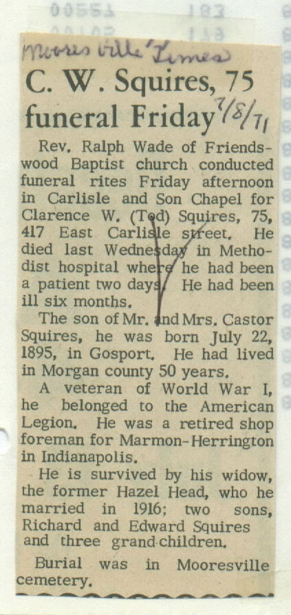 | Other | Age 75. Carlisle Chapel (Rev. Ralph Wade). Buried Mooresville Cemetery. Parents: Mr. & Mrs. Castor Squires. Veteran of World War I. |
