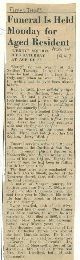 | Other | Age 85. Carlisle Chapel (Rev. Curtis Shook, pastor Nazarene Church.) Buried Mooresville Cemetery. Parents: Mr. & Mrs. Charles Squires. First wife died in 1906. |