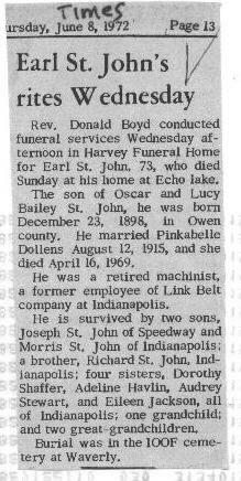 | Other | Age 73. Harvey Funeral Home (Rev. Donald Boyd.) Buried IOOF cemetery at Waverly. Parents: Oscar and Lucy Bailey St. John. |