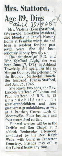 | Survived By | 2 sons, Rev. Lincoln Stafford and Paul Stafford; 13 grandchildren; 18 great- grandchildren; 3 great-great-grandchildren; brother, Grover Losh. (4 brothers and 4 sisters are deceased.) |