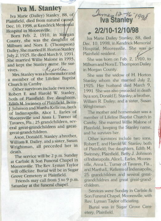 | Obituary Source | Mooresville Times, Dec. 26, 1998 |