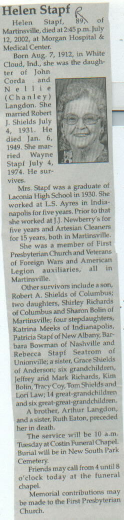 | Survived By | Spouse; son, Robert A. Shields; 2 daughters, Shirley Richards and Sharon Bolin; 4 stepdaughters, Katrina Meeks, Patricia Stapf, Barbara Bowman, and Rebecca Stapf; sister, Grace Shields; 6 grandchildren, Jeffrey and Mark Richards, Kim Bolin, Tracy Coy, Tom Shields, and Lori Law; 14 great-grandchildren; 6 great-great-grandchildren. |