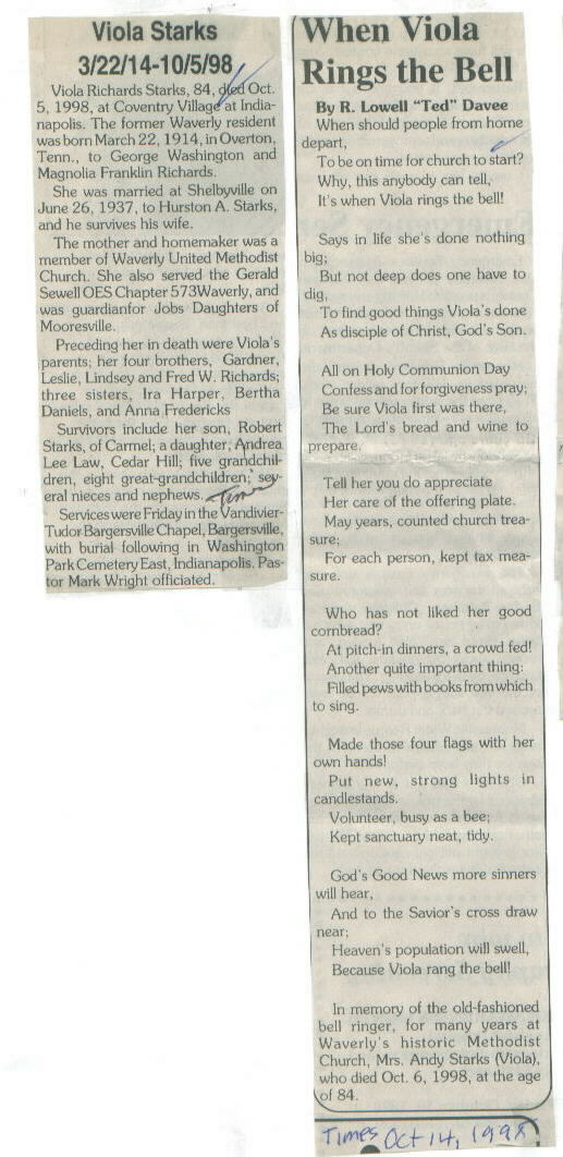 Other Age 84. Vandivier Tudor Bargersville funeral chapel (Pastor Mark Wright officiating.) Buried Washington Park East. Parents: George Washington and Magnolia Franklin Richards. Died in Indianapolis.