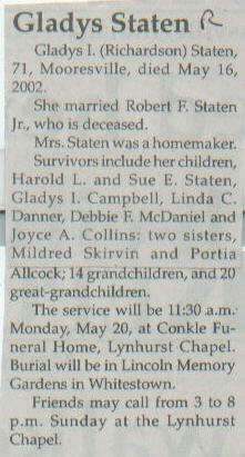 | Survived By | Children, Harold L. and Sue E. Staten, Gladys I. Campbell, Linda C. Danner, Debbie F. McDaniel, and Joyce A. Collins; 2 sisters, Mildred Skirvin and Portia Allcock; 14 grandchildren; 20 great-grandchildren. |