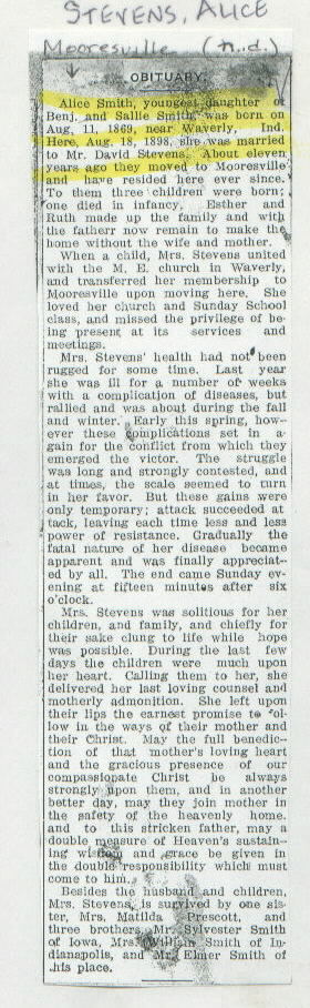 Survived By Husband; children, Ruth and Esther (another child died in infancy); sister, Mrs. Matilda Prescott; 3 brothers, Sylvester of Iowa, William of Indianapolis, and Elmer Smith.
