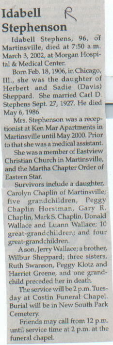 | Survived By | Daughter, Carolyn Chaplin; 5 grandchildren, Peggy Chaplin Horstman, Gary R. Chaplin, Mark S. Chaplin, Donald Wallace, and Luann Wallace; 10 great-grandchildren; 4 great-grandchildren. |