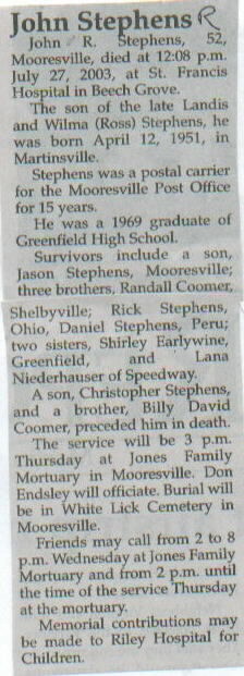 | Other | The son of the late Landis and Wilma (Ross) Stephens, he was born in Martinsville. A son, Christopher Stephens, and a brother, Billy David Coomer, preceded him in death. |