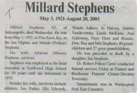 | Other | Born in Pine Knot, Ky. to the late Eliphus and Manda (Perkins) Stephens. Preceded in death by a daughter, Ina Stephens. |