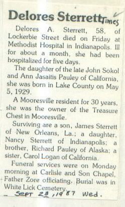 | Survived By | Son, James Sterrett of New Orleans, La.; daughter, Nancy Sterrett; brother, Richard Pauley of Alaska; sister, Carol Logan of Calif. (A son, Gary Sterrett, died Oct. 17, 1984, age 24.) |
