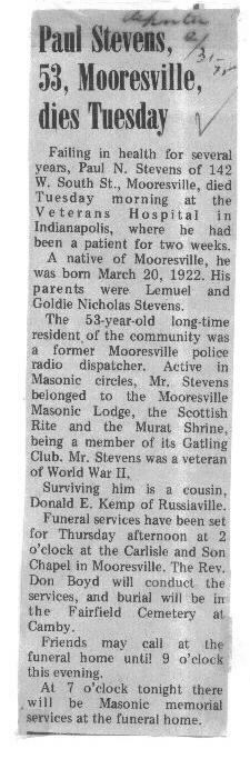| Other | Age 53. Carlisle Chapel (Rev. Donald Boyd.) Buried Fairfield cemetery at Friendswood. Masonic memorial service. Parents: Lemuel and Goldie Nicholas Stevens. Veteran, World War II. |