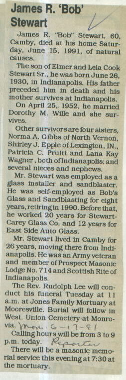 | Other | Age 60. Jones Mortuary (Rev. Rudolph Lee.) Buried West Union cemetery, Monrovia. Parents: Elmer and Lela Cook Stewart, Jr. Died at his home; born in Indianapolis. |