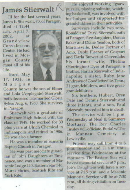 | Survived By | Widow; 2 sons, Ronald and Daryl Stierwalt; 5 daughters, Donna Baker, Diana Yeadon, Dedee Fortner, Debbie Fleener, and Darla Brewer; former wife, Thelma (Herrington) Dyer; brother, Harlan Stierwalt; sister, Ruby Jane Andrews; 21 grandchildren; 5 great-grandchildren. |