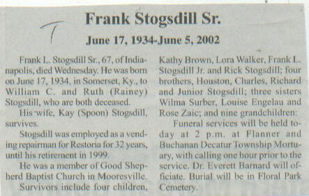 Survived By Widow; 4 children, Kathy Brown, Lora Walker, Frank L. Stogsdill, Jr., and Rick Stogsdill; 4 brothers, Houston, Charles, Richard, and Junior Stogsdill; 3 sisters, Wilma Surber, Louise Engelau, and Rose Zaic; 9 grandchildren.