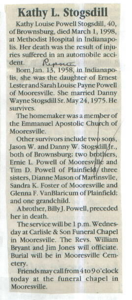 Survived By Husband; 2 sons, Jason W. and Danny W. Stogsdill, Jr.; 2 brothers, Ernie Powell and Tim D. Powell; 3 sisters. (A brother, Billy J. Powell, is deceased.)