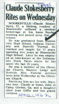 | Other | Age 56. Funeral at Mooresville Christian Church. Graduate Mooresville HS, Ind. U., and Central Normal. Coached and taught school for 17 years at Mooresville. |