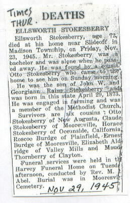 | Survived By | Cousins, Otto Stokesberry, Claude and Horace Stokesberry, Roscoe Burdge, Ernest Burdge, Elizabeth Aldridge, and Maude Thornberry of Clayton. |