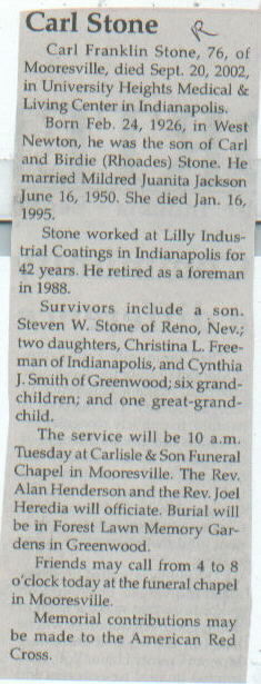 | Survived By | Son, Steven W. Stone; 2 daughters, Christina L. Freeman and Cynthia J. Smith; 6 grandchildren; one great-grandchild. |