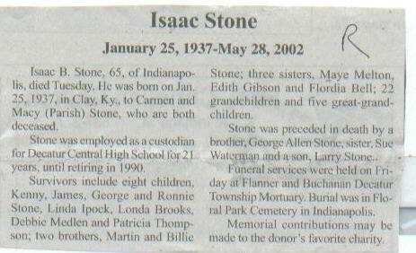 | Survived By | Eight children, Kenny, James, George, and Ronnie Stone, Linda Ipock, Londa Brooks, Debbie Medlen, and Patricia Thompson; 2 brothers, Martin and Billie Stone; 3 sisters, Maye Melton, Edith Gibson, and Flordia Bell; 22 grandchildren; 5 great-grandchildren. |