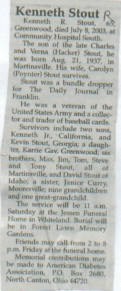 Survived By Widow; 2 sons, Kenneth, Jr. and Kevin Stout; daughter, Karrie Gay; 6 brothers, Max, Jim, Tom, Steve, Tony, and David Stout; sister, Janice Curry; 9 grandchildren; one great-grandchild.