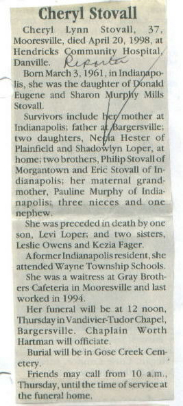| Survived By | Mother in Indianapolis; father in Bargersville; 2 daughters, Necia Hester of Plainfield and Shadowlynn Loper; 2 brothers, Phillip and Eric Stovall; grandmother; 3 nieces; 1 nephew. (A son and 2 sisters are deceased.) |