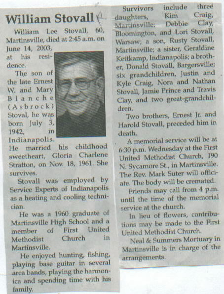 | Other | The son of the late Ernest W. and Mary Blanche (Asbrock) Stoval, he was born in Indianapolis. The body will be cremated. |