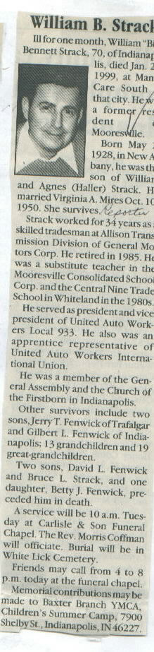 Other Age 70. Carlisle Chapel (Rev. Morris Coffman officiating.) Parents: William and Agnes Haller Strack. Retired from Allison's, 1985. Substitute teacher, Mooresville and Central Nine Trade School at Whiteland.