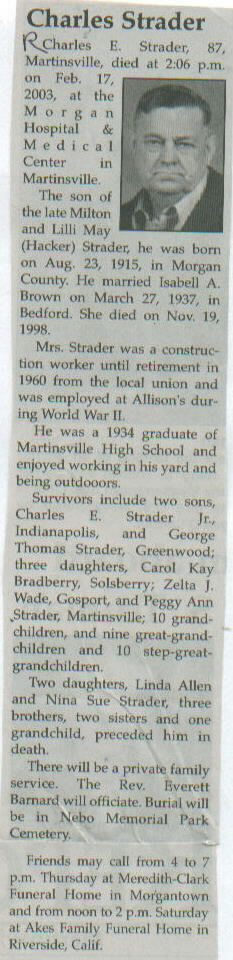 | Other | The son of the late Milton and Lilli May (Hacker) Strader, he was born in Morgan County. Preceded in death by two daughters, Linda Allen and Nina Sue Strader; three brothers; two sisters; and one grandchild. |