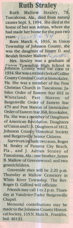 | Other | Age 78. Vandivier-Tudor Bargersville Chapel. Graveside services at Mallow cemetery in White River Twp., Johnson Co. (Rev. Roger D. Gifford officiating.) Graduate Union Township HS 1934. Parents: Emery D. and Beulah Mallow. |