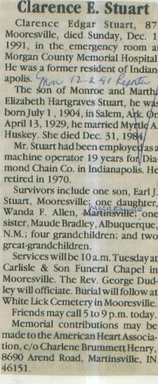 | Other | Age 87. Carlisle chapel (Rev. George Dudley officiating.) Parents: Monroe and Martha Elizabeth Hartgraves Stuart. Died in Morgan County hospital; born in Salem, Ark. |