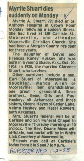 | Other | Age 79. Carlisle Chapel (Rev. Duane Moss officiating.) Died following sudden illness at St. Anthony's hospital in Crown Point. Parents: David and Frances Raney Huskey. Former address 150 Carlisle St., Mooresville. |