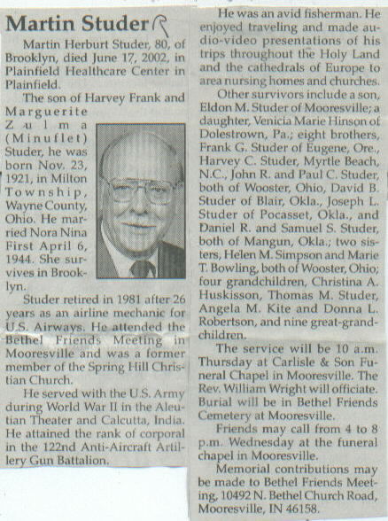 | Survived By | Widow; son, Eldon M. Studer; daughter, Venica Marie Hinson; 8 brothers, Frank G., Harvey C., John R., Paul C., David B., Joseph L., Daniel R., and Samuel S. Studer; 2 sisters, Helen M. Simpson and Marie T. Bowling; 4 grandchildren, Christina A. Huskisson, Thomas M. Studer, Angela M. Kite, and Donna L. Robertson; 9 great-grandchildren. |
