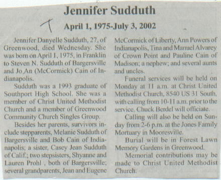 Survived By Parents, Steven N. Sudduth of Bargersville and Jo An (McCormick) Cain of Indianapolis; stepparents, Melanie Sudduth of Bargersville and Bob Cain of Indianapolis; sister, Casey Jean Sudduth; 2 stepsisters, Shyanne and Lauren Prohl; grandparents, Jean and Eugene McCormick, Tina and Manuel Alvarey,and Pauline Cain; one nephew; several aunts and uncles.
