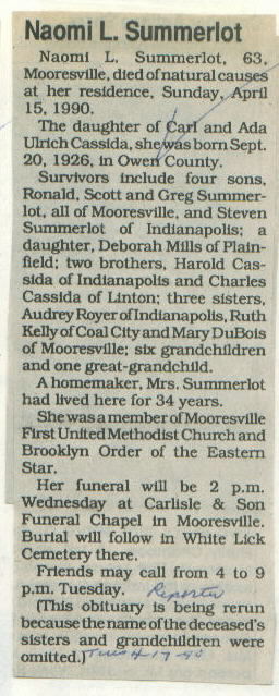 | Survived By | Sons, Ronald, Scott, Gregg, and Steven Summerlot; daughter, Deborah Mills; 2 brothers, Harold Cassida and Charles Cassida of Linton; 3 sisters, Audrey Royer, Ruth Kelly, and Mary DuBois; 6 grandchildren; 1 great-grandchild. |