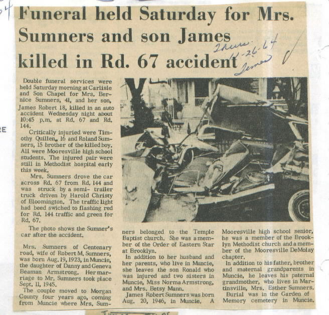 | Other | Killed when her car was struck by a semi-trailer truck as she drove across State Road 67 at State Road 144. Double funeral with son, James Robert Sumners, who was also killed in the accident, at Carlisle Chapel. Son Ronald was critically injured in the wreck. Buried Garden of Memory cemetery, Muncie. [Timothy Quillen, age 16, was also critically injured.] |