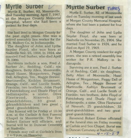| Survived By | Son, Fred, Jr. of Redding, Calif.; 6 daughters, Betty Allen, Hazel Haase, Peggy Dell, Maggie Brewer, Kathlyn Brummett, and Lucille Smith; 2 brothers, John Floyd and Thurle Floyd; sister, Olive Fleetwood; 25 grandchildren; 33 great-grandchildren; 2 great-great-grandchildren. |