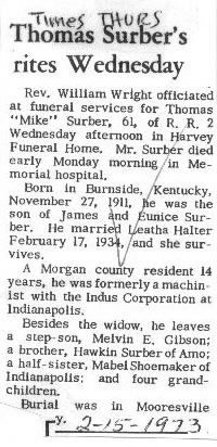 | Survived By | Widow; stepson, Melvin E. Gibson; brother, Hawkins Surber of Amo; half sister, Mabel Shoemaker of Indianapolis; 4 grandchildren. |