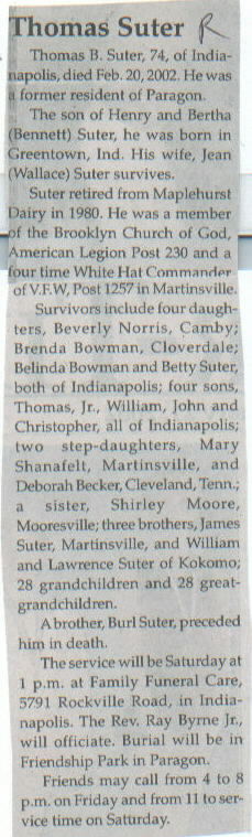 | Survived By | Widow; 4 daughters, Beverly Norris, Brenda Bowman, Belinda Bowman, and Betty Suter; 4 sons, Thomas, Jr., William, John, and Christopher; 2 stepdaughters, Mary Shanafelt and Deborah Becker; sister, Shirley Moore; 3 brothers, James, William, and Lawrence Suter; 28 grandchildren; 28 great-grandchildren. |