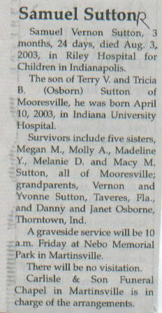 | Survived By | Parents, Terry V. and Tricia B. (Osborn) Sutton; 5 sisters, Megan M., Molly A., Madeline Y., Melanie D., and Macy M. Sutton; grandparents, Vernon and Yvonne Sutton, and Danny and Janet Osborne. |